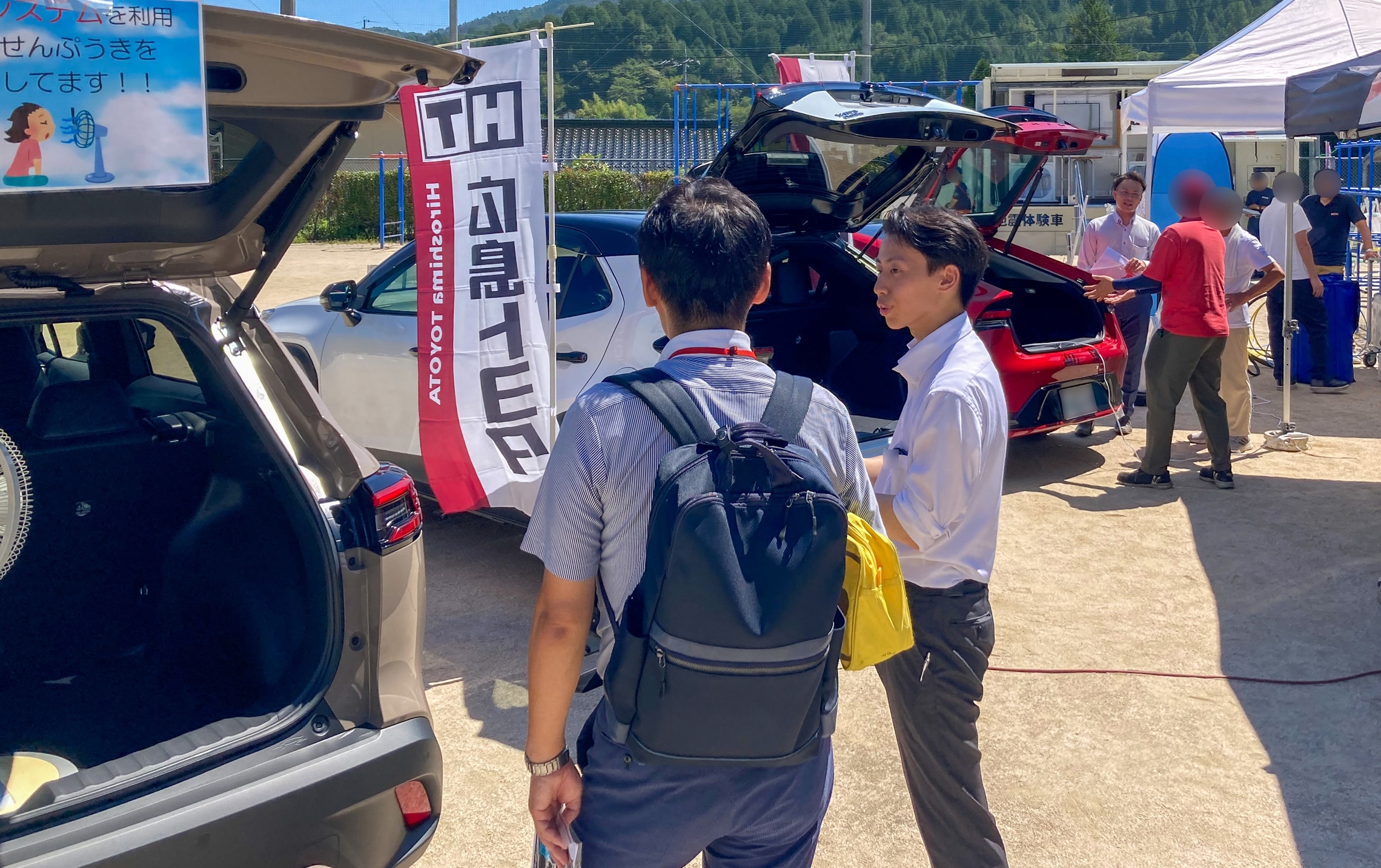 前回のやすにし防災フェスティバルと同様に西風新都・広島北店のスタッフが参加し、プリウス等の試乗車を使い非常用給電システムの実演をはじめ様々なコンテンツをご用意し、多くの方にクルマが果たせる防災の役割を体感いただける機会となりました。
