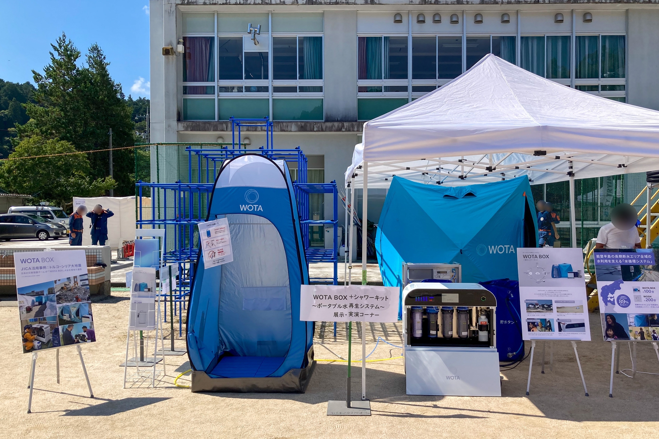 非常用給電システムを利用し『WOTABOX+シャワーキット~ポータブル水再生システム』を実演しました。