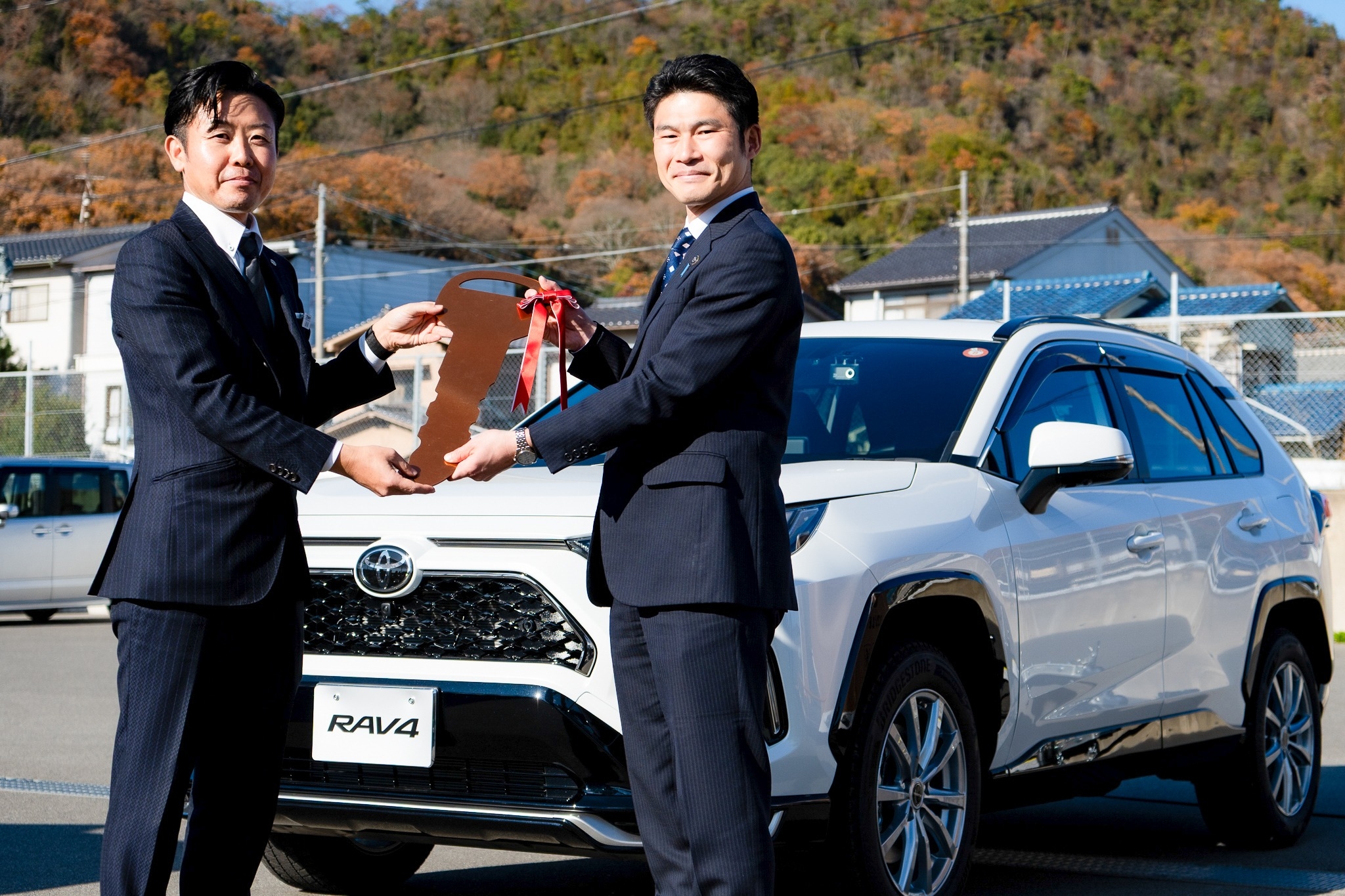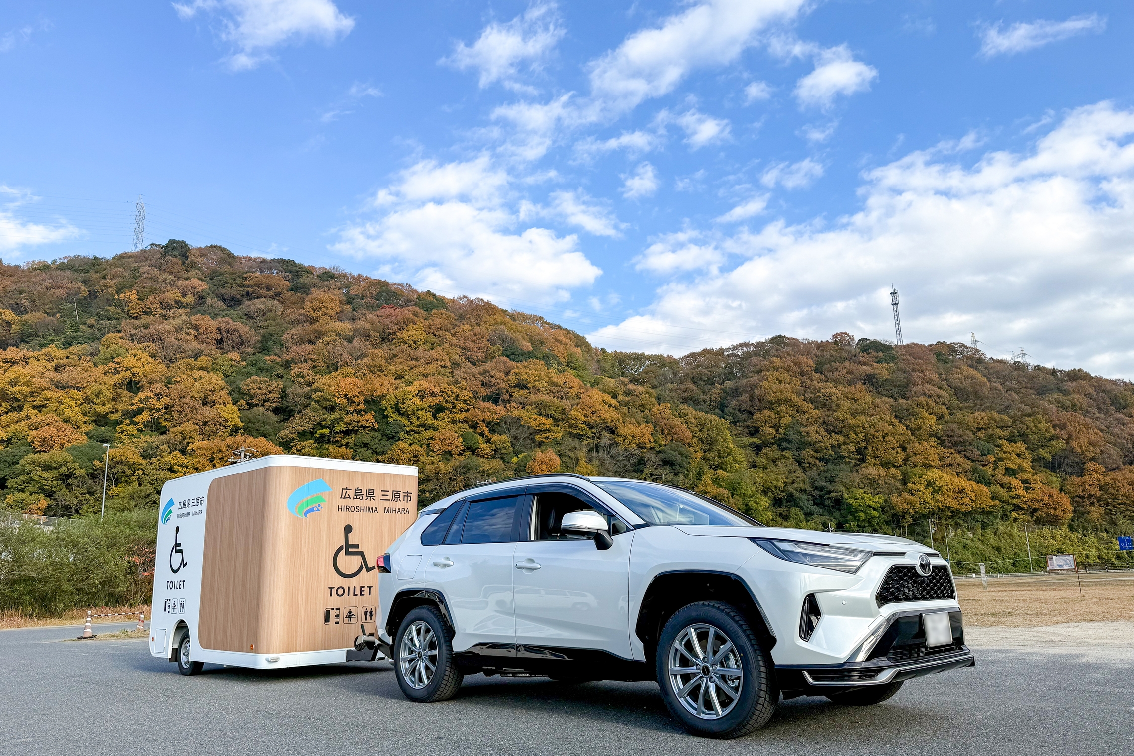 私たち広島トヨタは、けん引車両「RAV4」とモバイルトイレ(車両部分)のメンテナンスを担当いたします。
