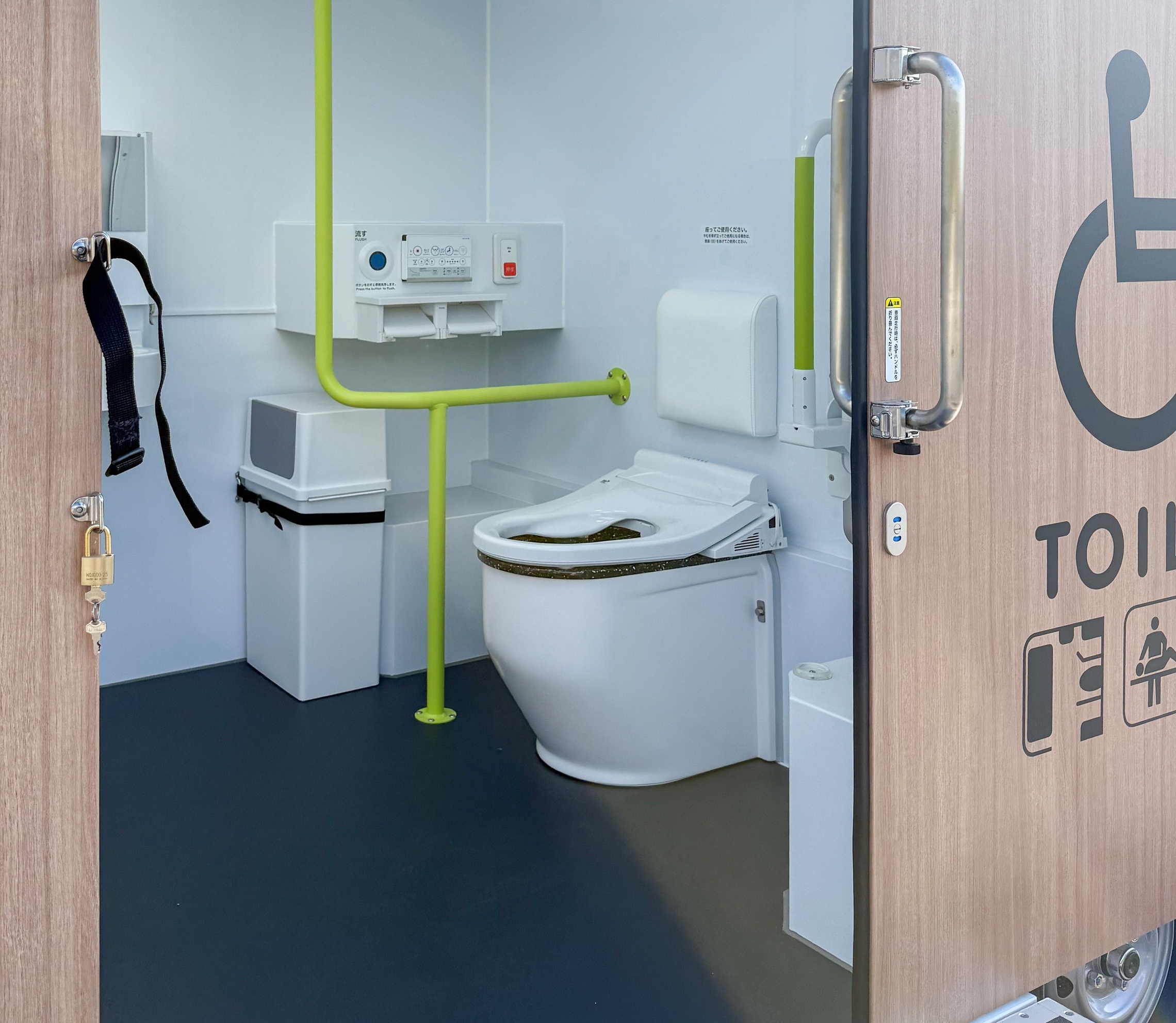 トヨタ自動車が販売している普通免許でけん引可能な「いつでも・どこでも・だれにでも」快適なトイレが使える移動型バリアフリートイレトレーラーです。