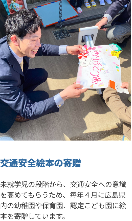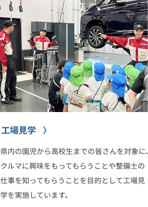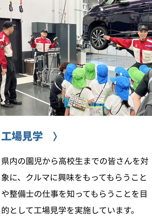 リニューアルオープンした三原店にて、園児のための社会科見学として店舗見学会を11月6日(木)・11月21(金)2日間にわたり開催しました。さくらこども園様からご依頼を受け、事前に引率の先生方と打ち合わせを行い「働く大人の姿」や「車の修理のお仕事」に興味をもってもらう、を目的に安全第一でコンテンツを準備しました。 ショールーム見学 はじめにショールームの内装や、スタッフが接客している様子を見てもらいました。 工場見学とタイヤ交換体験 その後みなさんが楽しみにしていた工場へ移動。 初めて入った工場にキラキラと目を輝かせている子どもたちに、説明するエンジニアスタッフもどこか誇らしげです。車がリフトで上がっていく様子や、普段なかなか見ることのない車の下を見てもらいました。 次に、タイヤ交換の体験です。 エンジニアスタッフが外したタイヤを、実際に触ってもらい、間近で見るタイヤに子どもたちも興味津々です。 そのあとは、タイヤ取り付けの時の「ナット締め」! 安全を考慮しエンジニアスタッフと一緒に作業しました。 スタッフも癒された特別な時間 最後は子どもたちに積極的に質問をしてもらい、楽しみながら学んでいただきました。これを機会に、クルマに興味をもっていただけると嬉しく思います。 今回の訪問で、子どもたちの笑い声が飛び交う店内に、普段とは違うほっこりした時間を過ごすことができ、三原店スタッフ一同癒されました。 広島トヨタのこれから 広島トヨタは、次世代を担う子どもたちのため、地域とともに歩み、学びの機会を提供し続けます。クルマを通じて『働くことの楽しさ』や『安全の大切さ』を伝え、未来に向けて夢を育む活動を積極的に行ってまいります。