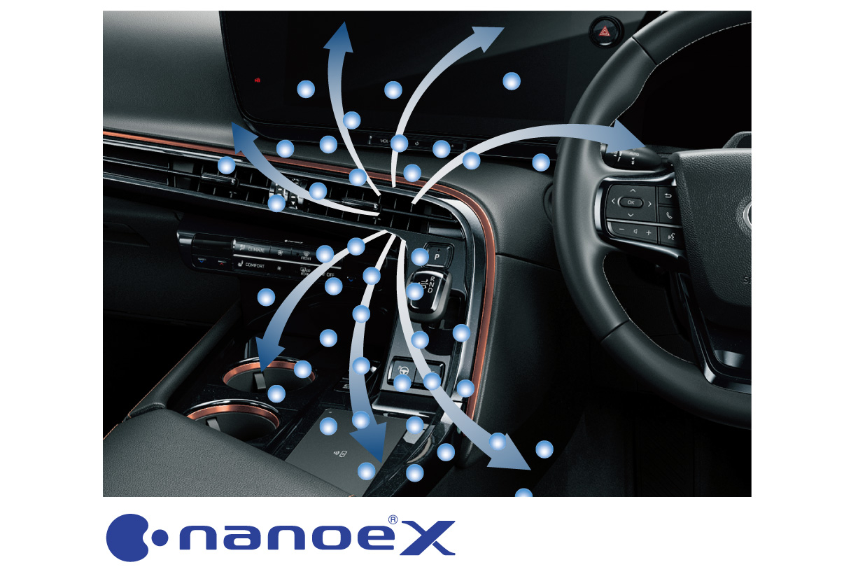 ナノイーXは、ナノイーに比べて、効果の元であるOHラジカルをより多く含む微粒子イオンです。インパネセンターの運転席側吹き出し口から室内へ放出され、車室内を快適な空気環境に導くナノイーがさらに進化しました。